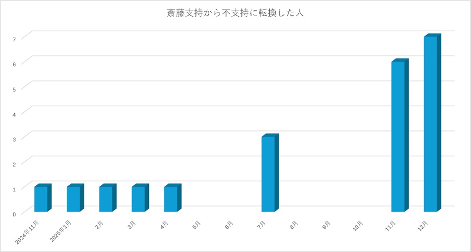 下のグラフは、斎藤知事を支持していた、または肯定的に見ていた人が、不支持へと転じた声を時系列で整理したものです。