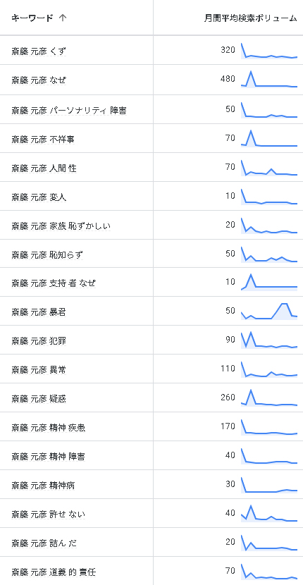 斎藤元彦知事に関するネガティブな検索需要はピークを過ぎ、全体的に減少傾向です。マスコミの報道量も減少しているので、世論の関心も自然と薄れてしまい、結果として議会が再び不信任決議を出しにくい空気が強まります。このような状況は斎藤知事の思う壺で、知事側に有利な状況と言えます。