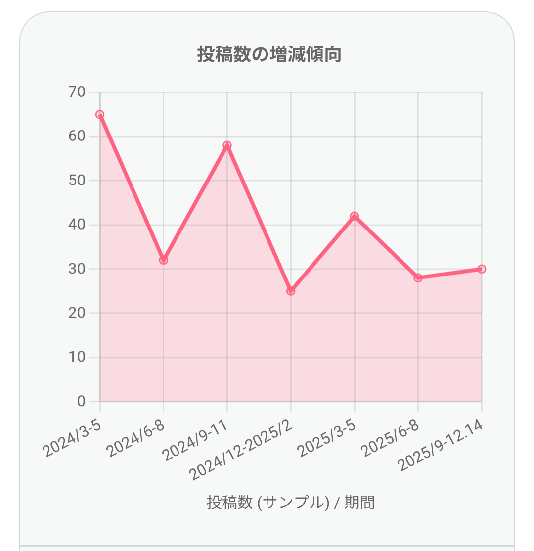 本記事では、2024年3月〜2025年12月14日までのX投稿を対象に行った分析結果と、その可視化グラフをもとに、
