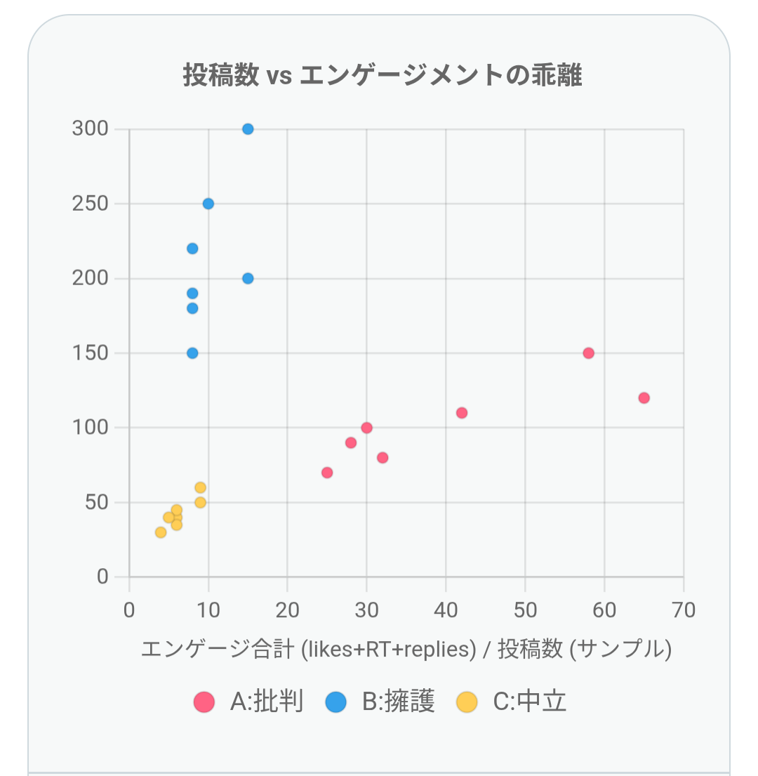 - 擁護投稿:数は少ないが、1投稿あたりの拡散が非常に大きい