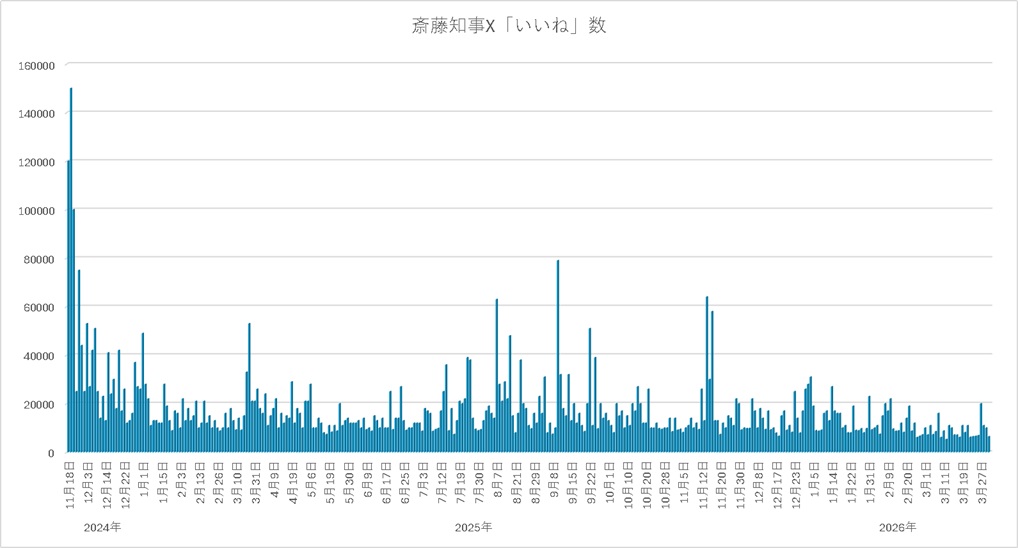そこで本稿では、斎藤知事のX投稿に対する「いいね数」に着目し、フォロワー数では見えない支持の質の変化を整理する。